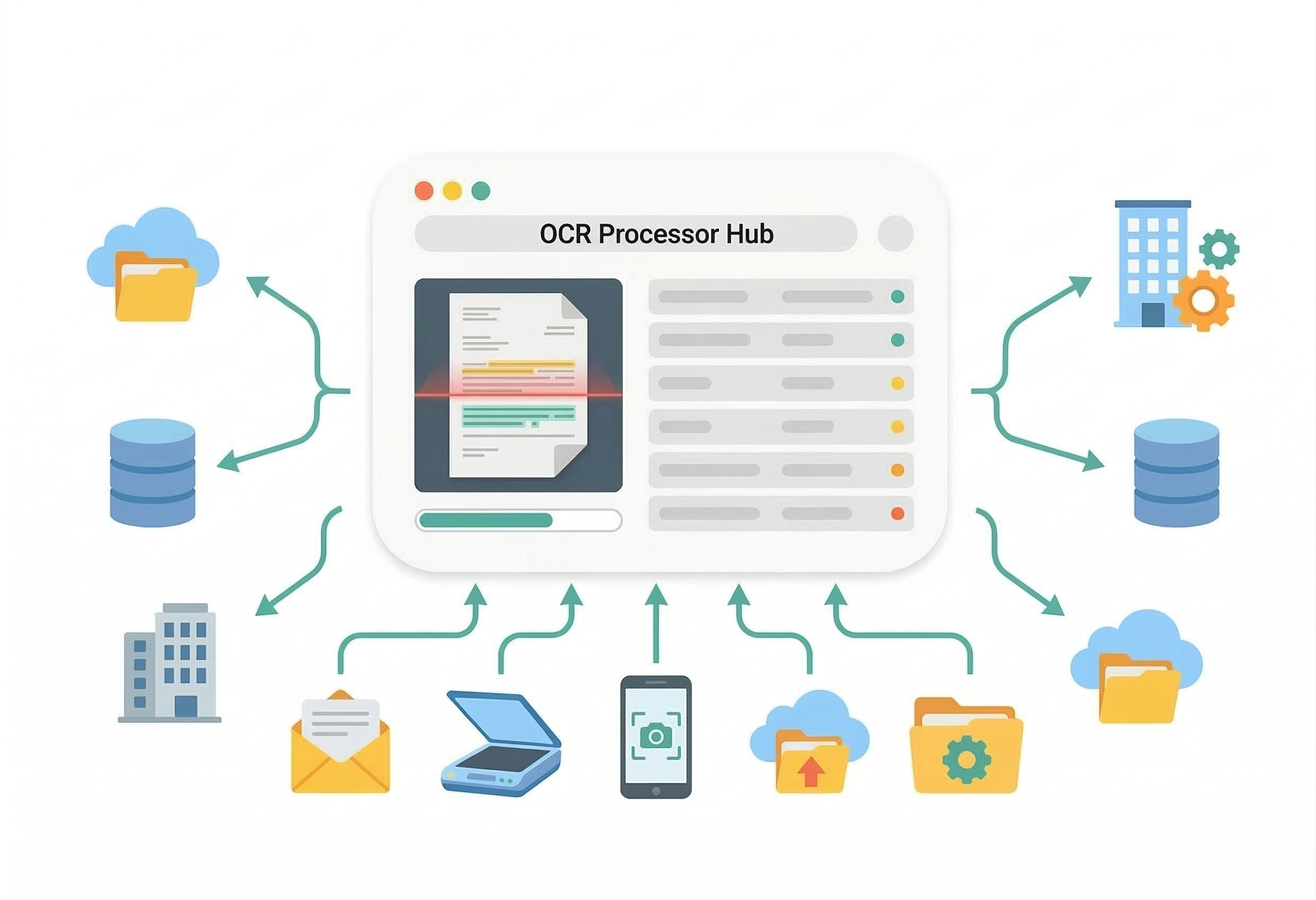 Sube tus documentos desde email, escáner o carpetas. Aceptamos cualquier formato para la extracción de datos de documentos y reconocimiento de texto con IA.
